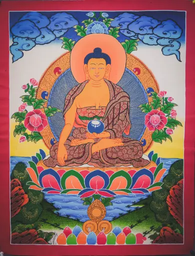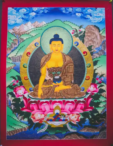 Shakyamuni Buddha Thangka – Luminous Tibetan Landscape – Find Your Grounding
