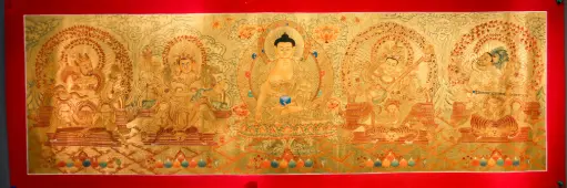 Shakyamuni, Amitabha, Chenrezig, Guru Rinpoche & Vajrasattva Thangka – Lateral Golden Assembly